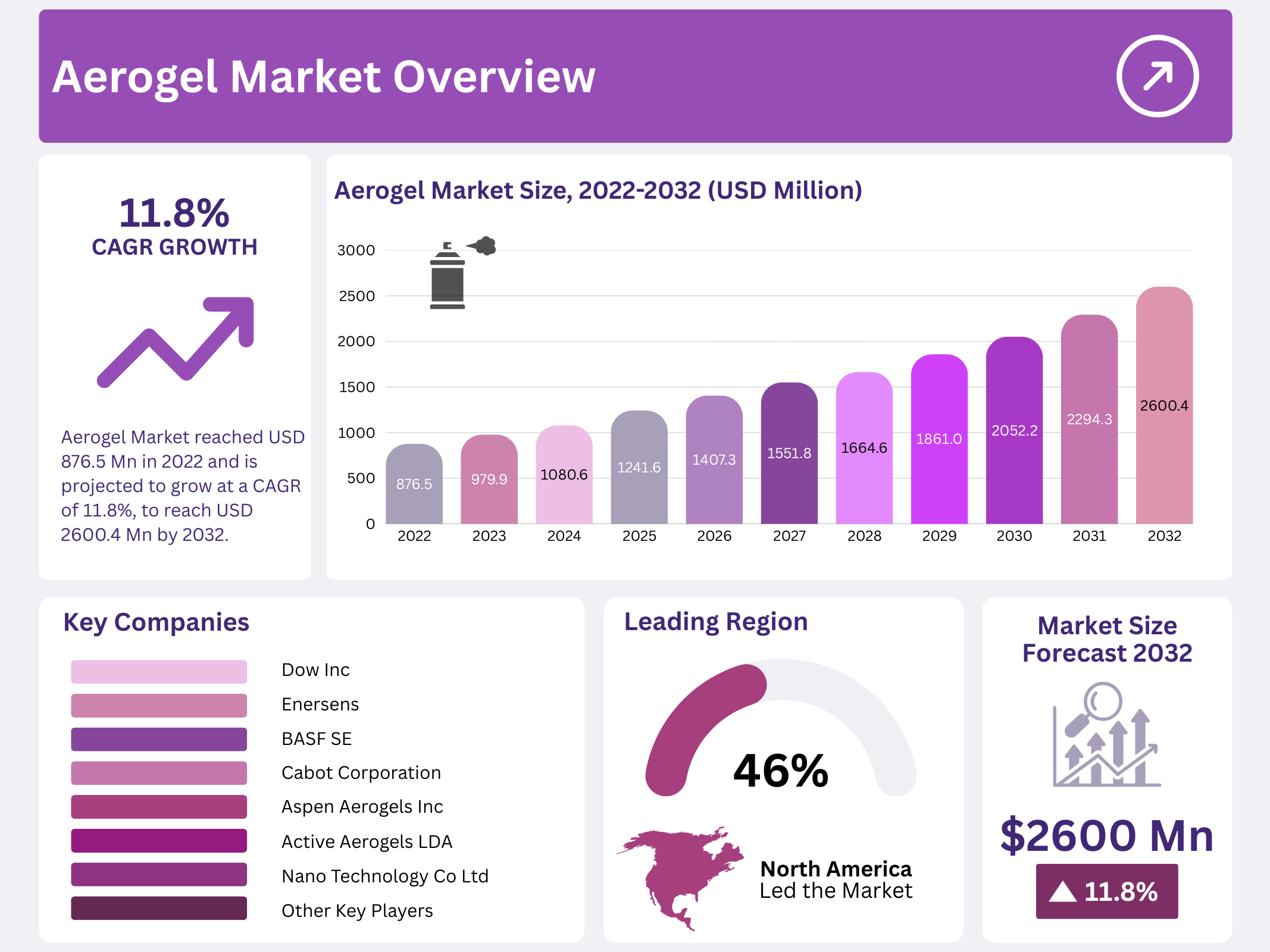 - The Aerogel Market reached USD 876.5 million in 2022 and is projected to grow at a CAGR of 11.8%, reaching USD 2600.4 million by 2032.