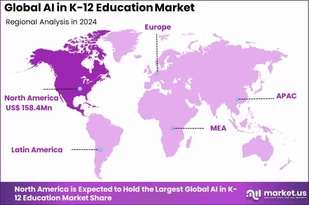 The Global AI in K-12 Education Market is on a remarkable growth path, projected to expand from USD 391.2 million in 2024 to USD 9,178.5 million by 2034. This represents a dynamic CAGR of 37.1% during 2025–2034. In 2024, North America stood as the leading region with over 40.5% share (USD 158.4 million), driven by advanced educational infrastructure and strong government support. The market’s momentum stems from rising demand for personalized learning, AI tutors, and adaptive classroom solutions, coupled with increasing investments in digital literacy programs worldwide.