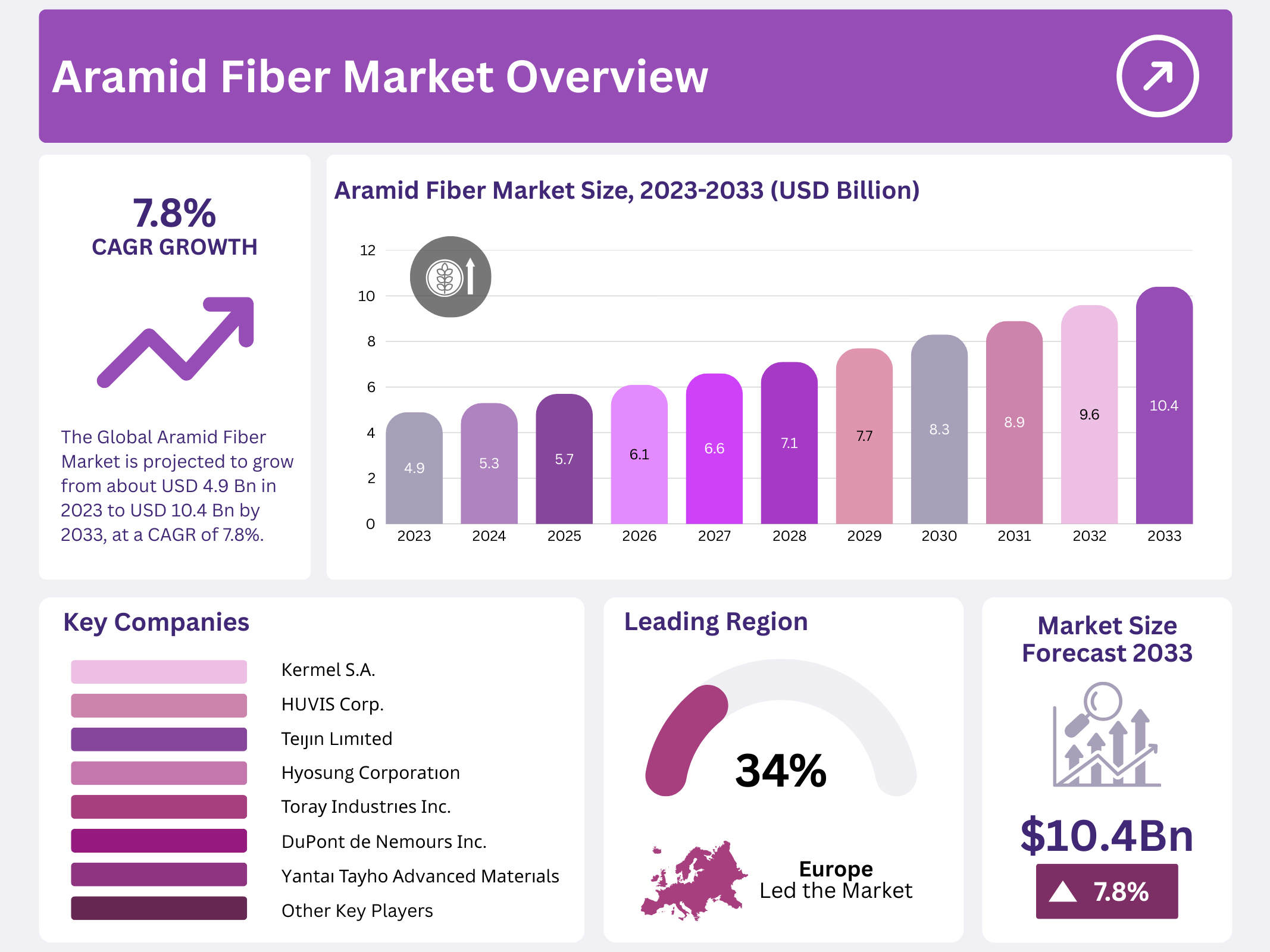 - The Global Aramid Fiber Market is projected to grow from about USD 4.9 billion in 2023 to USD 10.4 billion by 2033, at a CAGR of 7.8%.