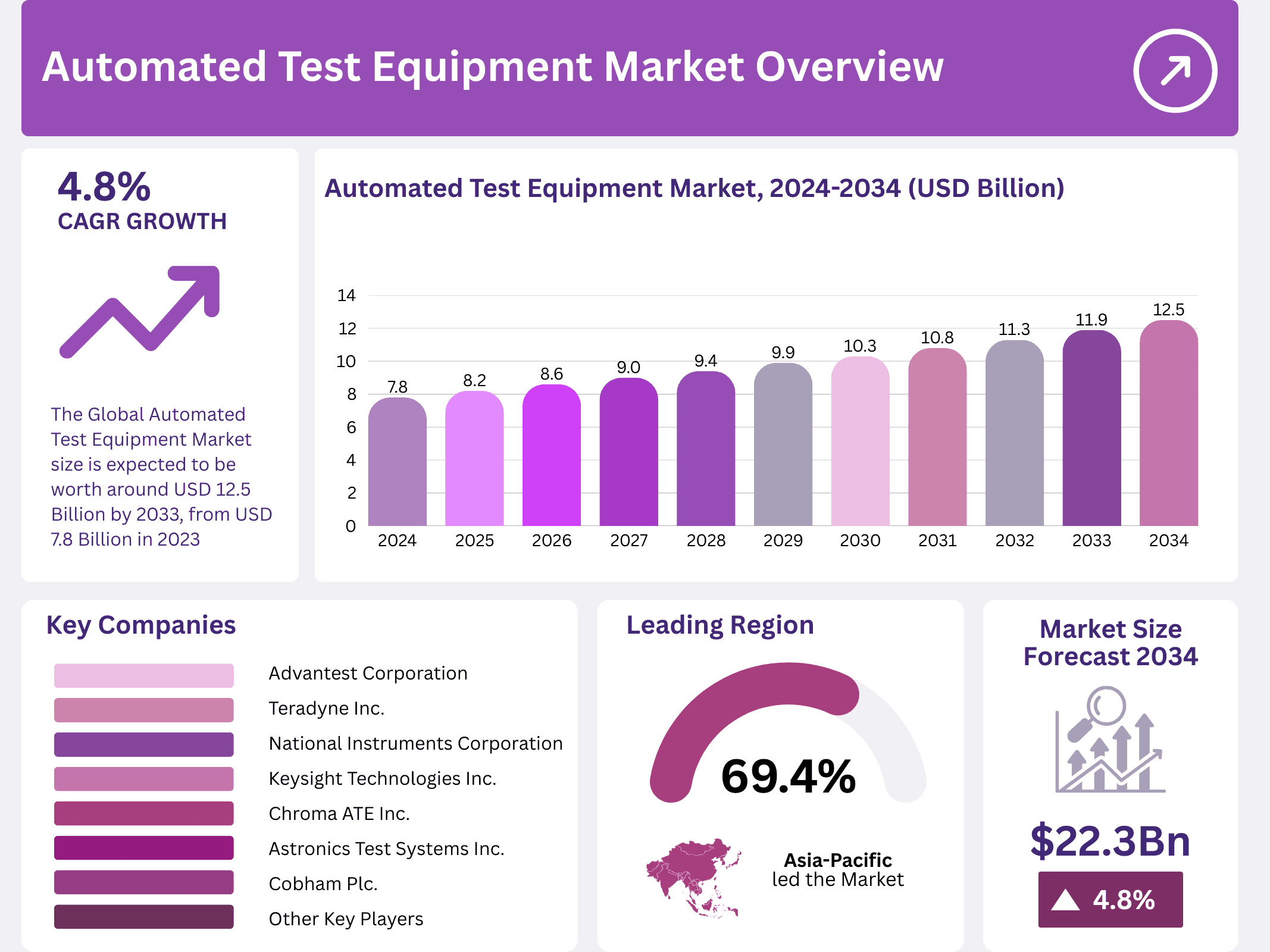 - The Automated Test Equipment Market reached USD 7.8 billion in 2023 and projects growth to USD 12.5 billion by 2033 at a 4.8% CAGR