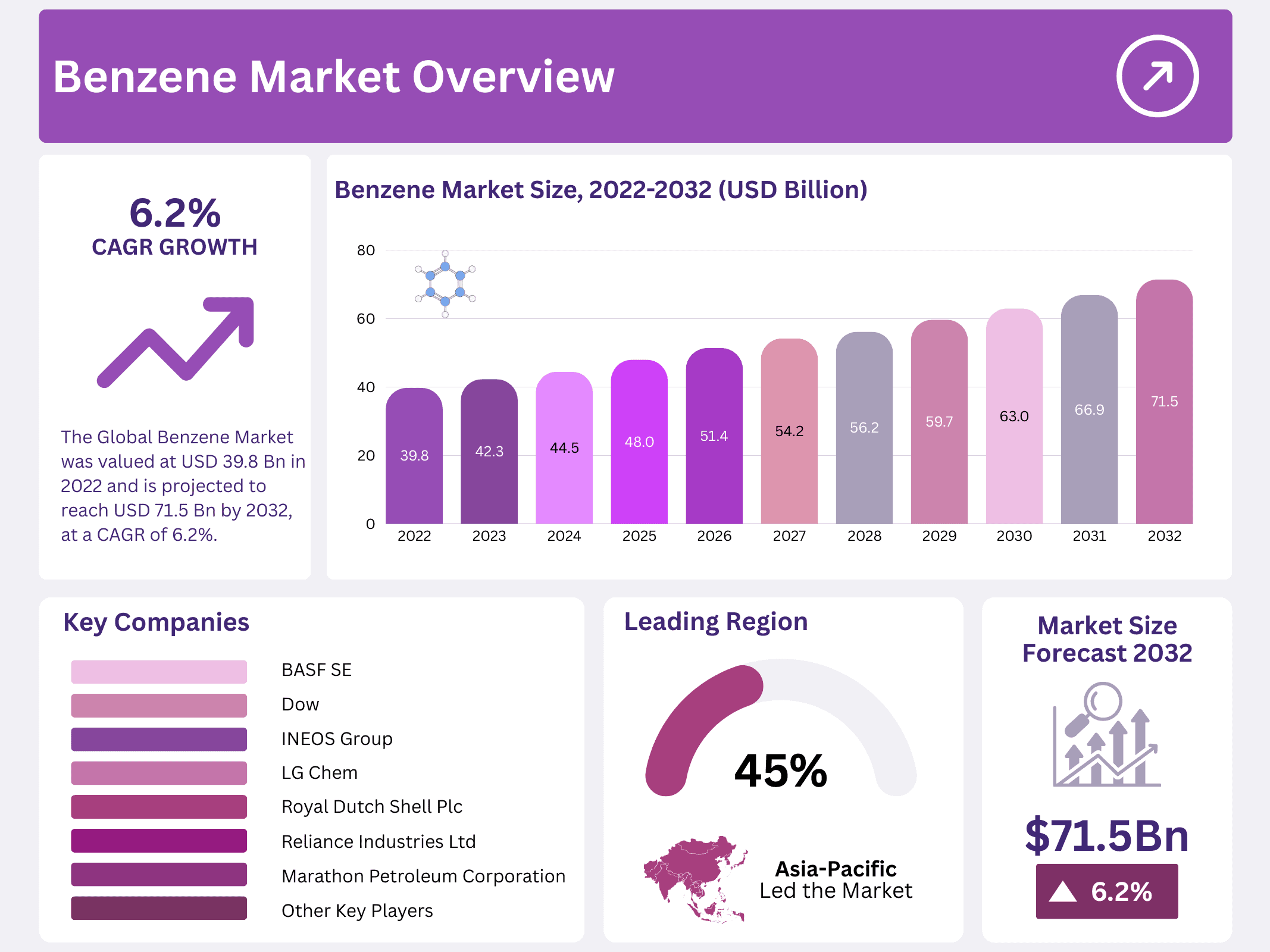 - The Global Benzene Market was valued at USD 39.8 billion in 2022 and is projected to reach USD 71.5 billion by 2032, at a CAGR of 6.2% from 2023 to 2032.