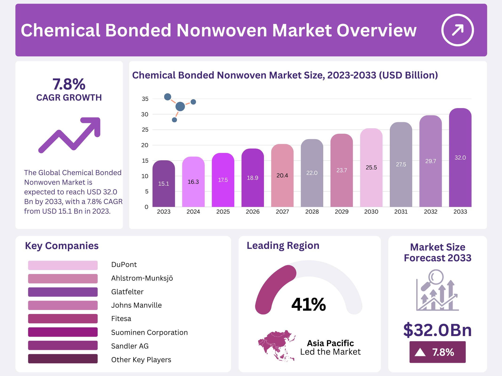 - The Global Chemical Bonded Nonwoven Market is expected to reach USD 32.0 billion by 2033, with a 7.8% CAGR from USD 15.1 billion in 2023.