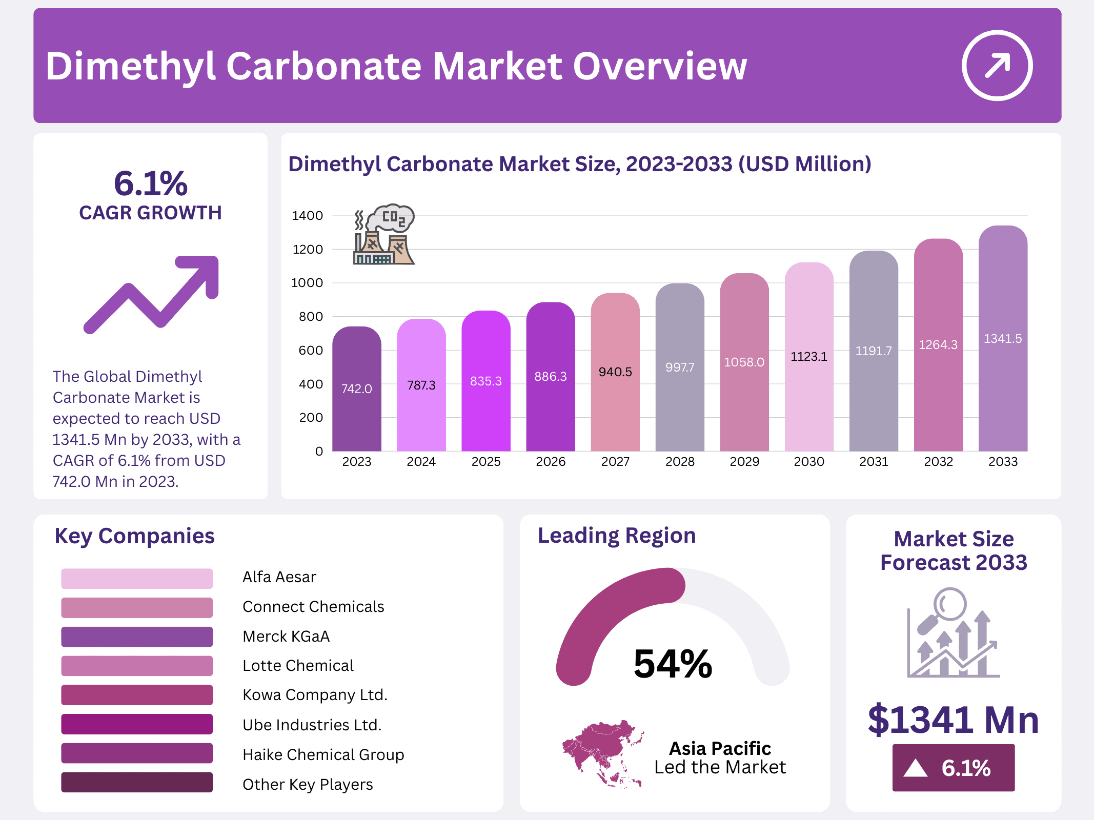 - The Global Dimethyl Carbonate Market is expected to reach USD 1341.5 million by 2033, with a CAGR of 6.1% from USD 742.0 million in 2023.