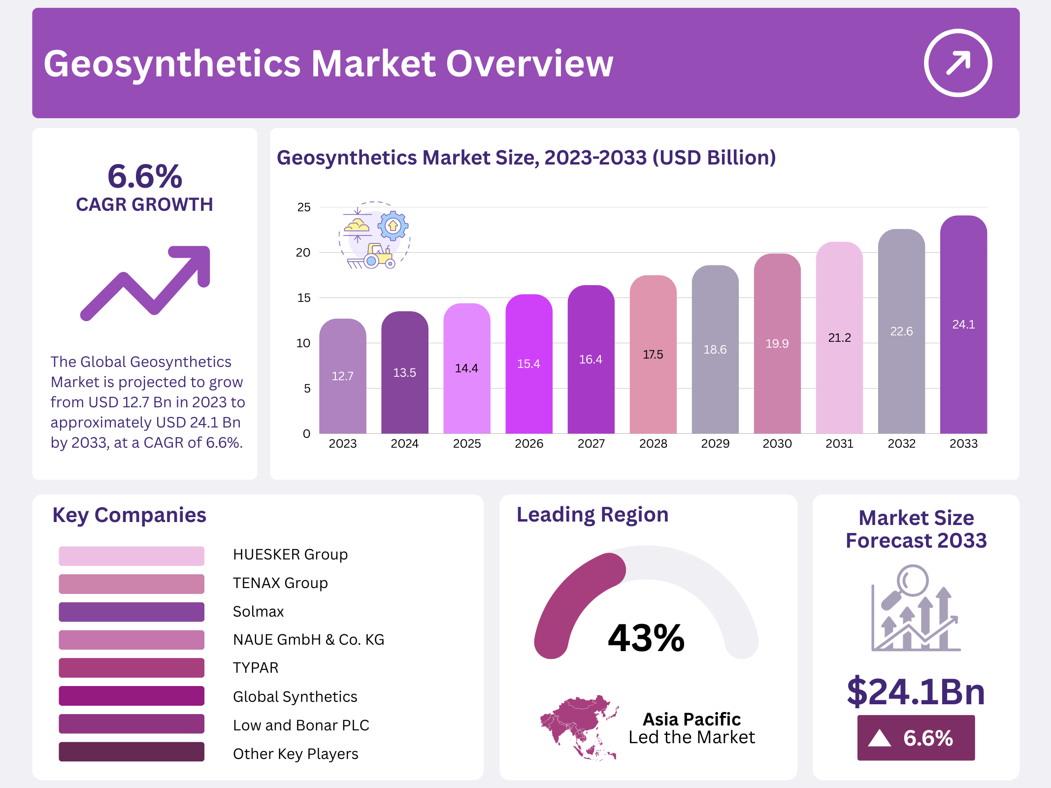 - The Global Geosynthetics Market is projected to grow from USD 12.7 billion in 2023 to approximately USD 24.1 billion by 2033, at a steady CAGR of 6.6% during the forecast period (2023–2033).