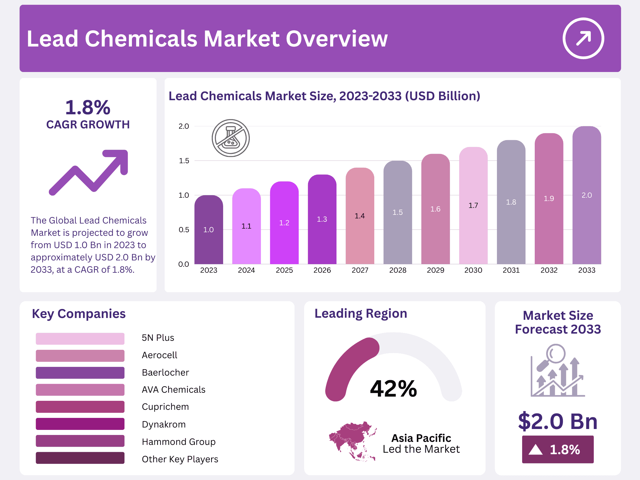 - The Global Lead Chemicals Market is projected to grow from USD 1.0 billion in 2023 to approximately USD 2.0 billion by 2033, at a CAGR of 1.8%.