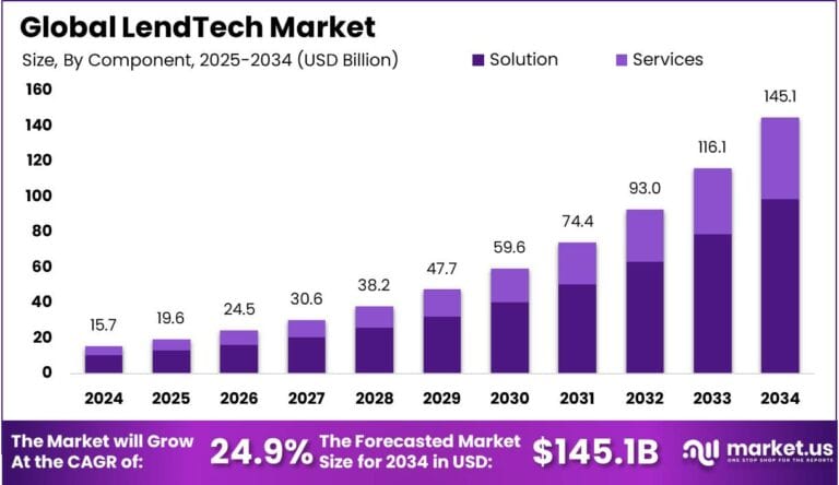 The LendTech Market is expected to grow at a CAGR of 24.90%, reaching USD 145.1 Billion by 2034.