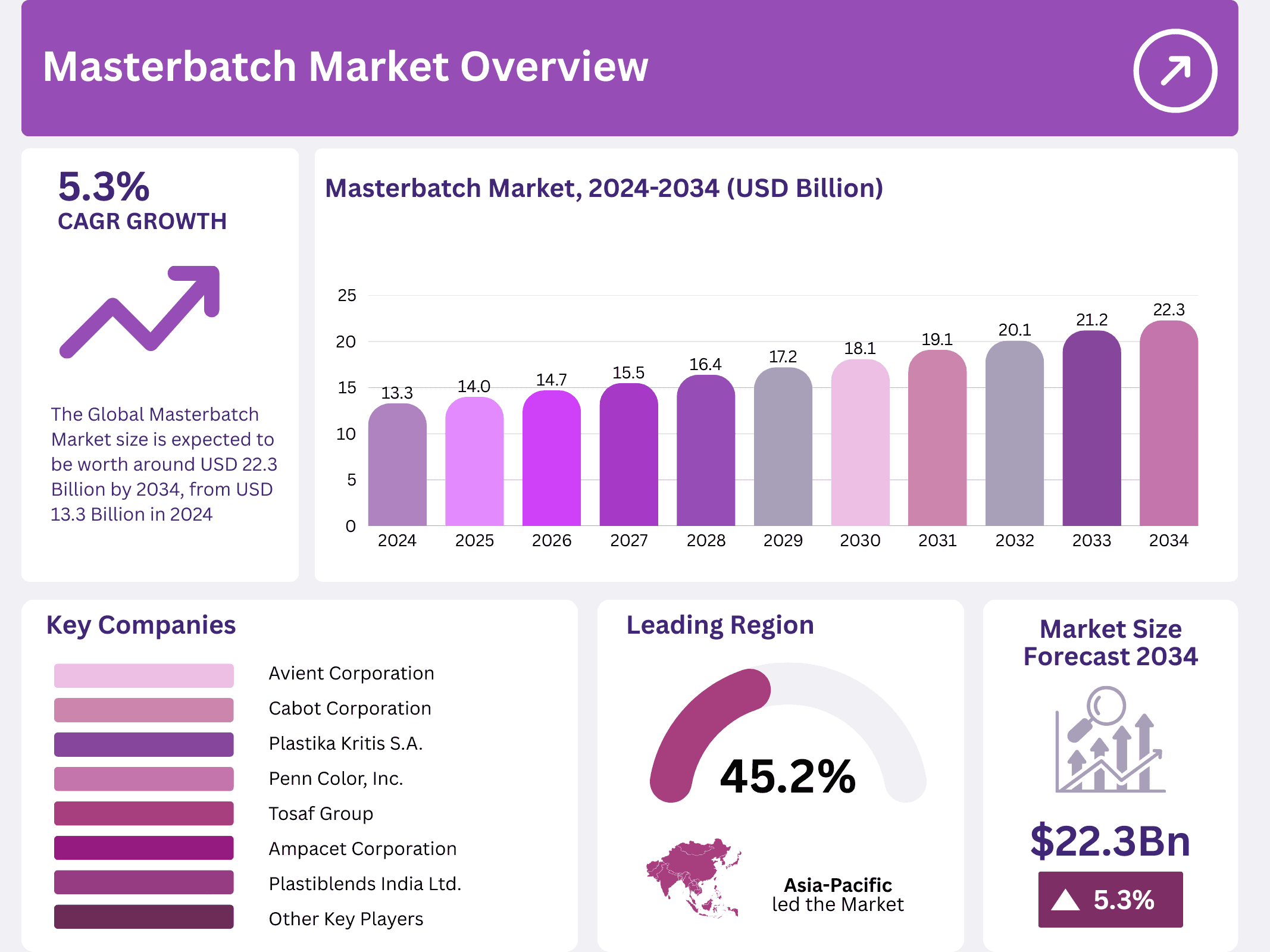 - The Global Masterbatch Market is projected to grow from USD 13.3 billion in 2024 to USD 22.3 billion by 2034, at a CAGR of 5.3%