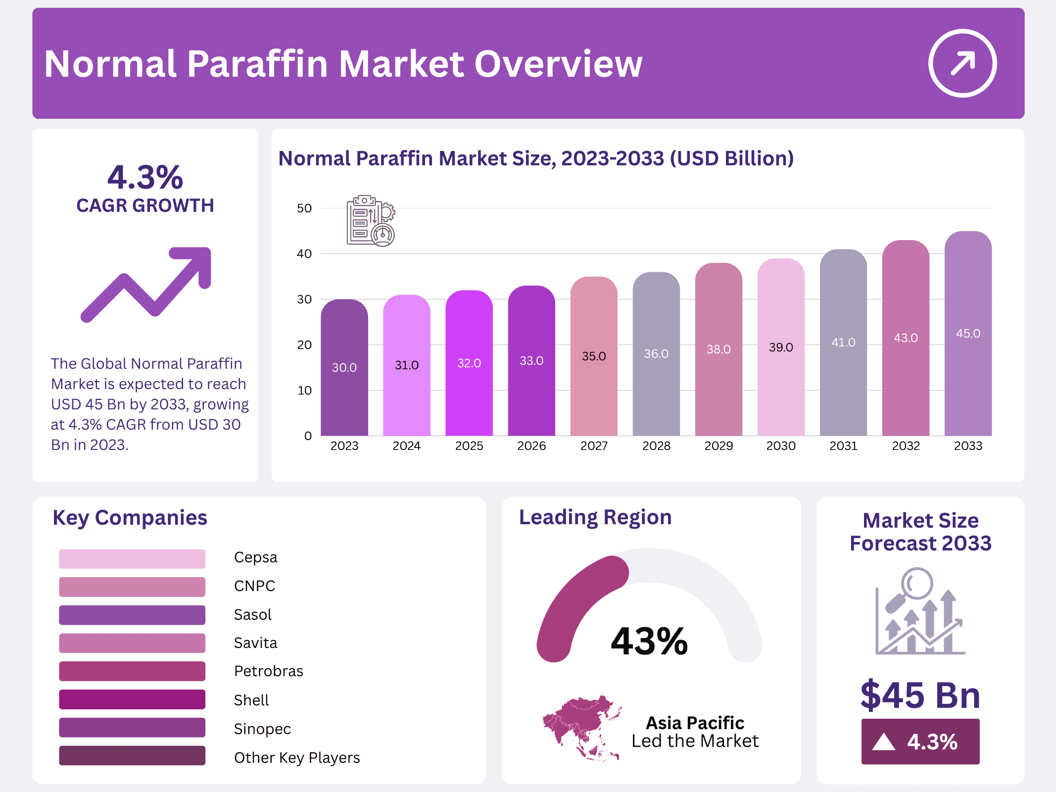 - The Global Normal Paraffin Market is expected to reach USD 45 billion by 2033, growing at 4.3% CAGR from USD 30 billion in 2023.