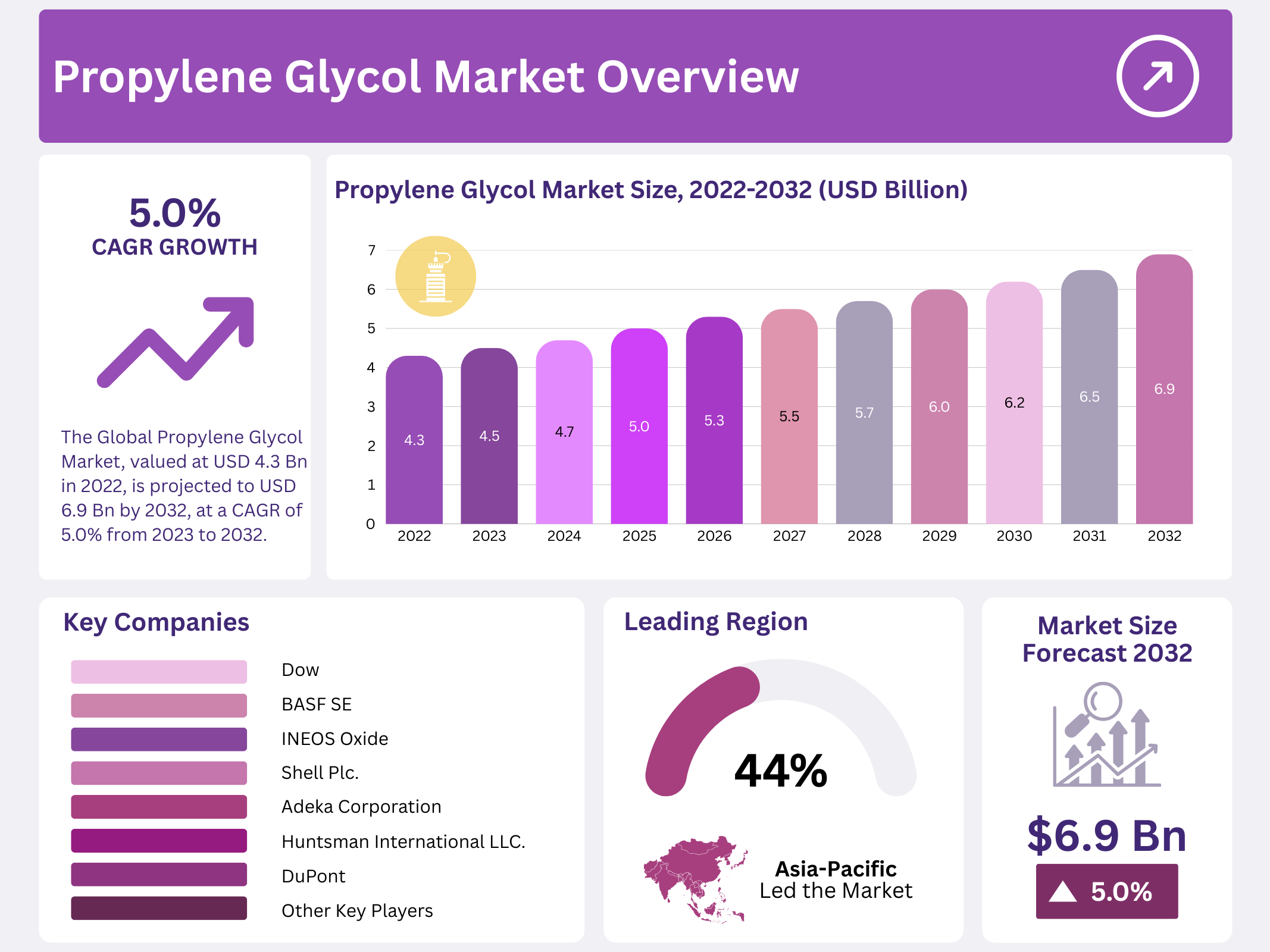- The Global Propylene Glycol Market was valued at USD 4.3 billion in 2022 and is projected to reach USD 6.9 billion by 2032, at a steady CAGR of 5.0% from 2023 to 2032.