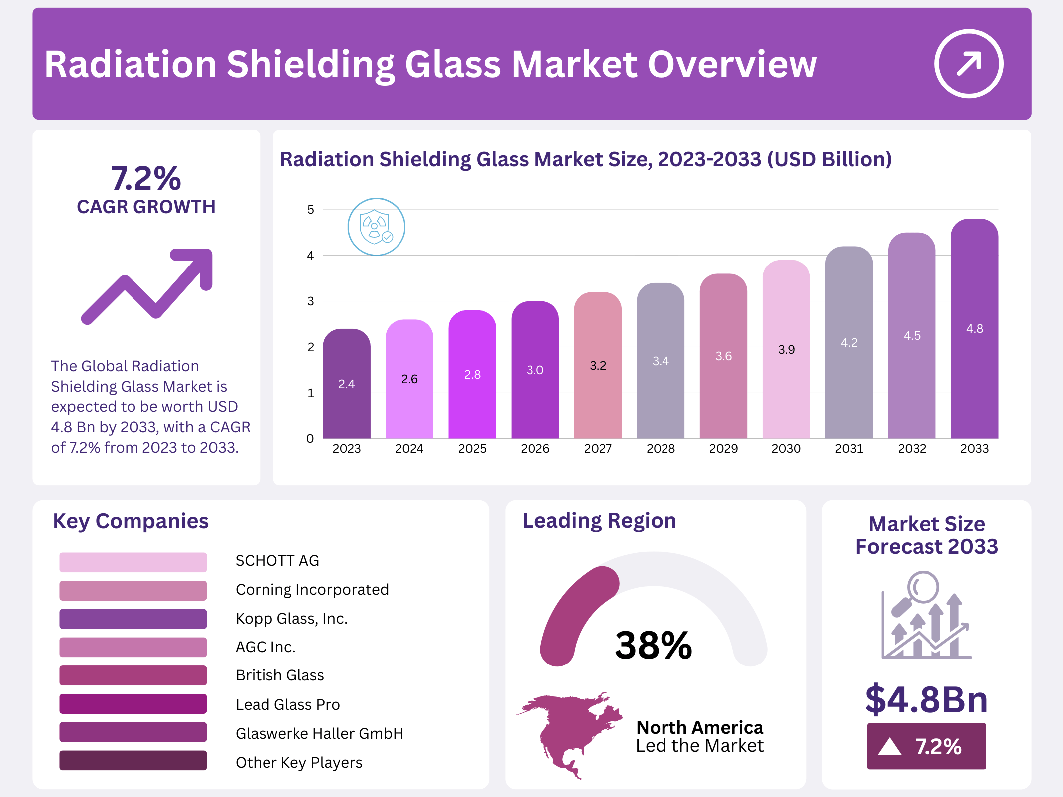 New York, NY – January 07, 2026 – The Global Radiation Shielding Glass Market is experiencing significant growth, driven by increasing demand across various industries, including healthcare, nuclear energy, and research laboratories. The market size is expected to reach approximately USD 4.8 billion by 2033, growing from USD 2.4 billion in 2023, at a compound annual growth rate (CAGR) of 7.2% during the forecast period from 2023 to 2033.