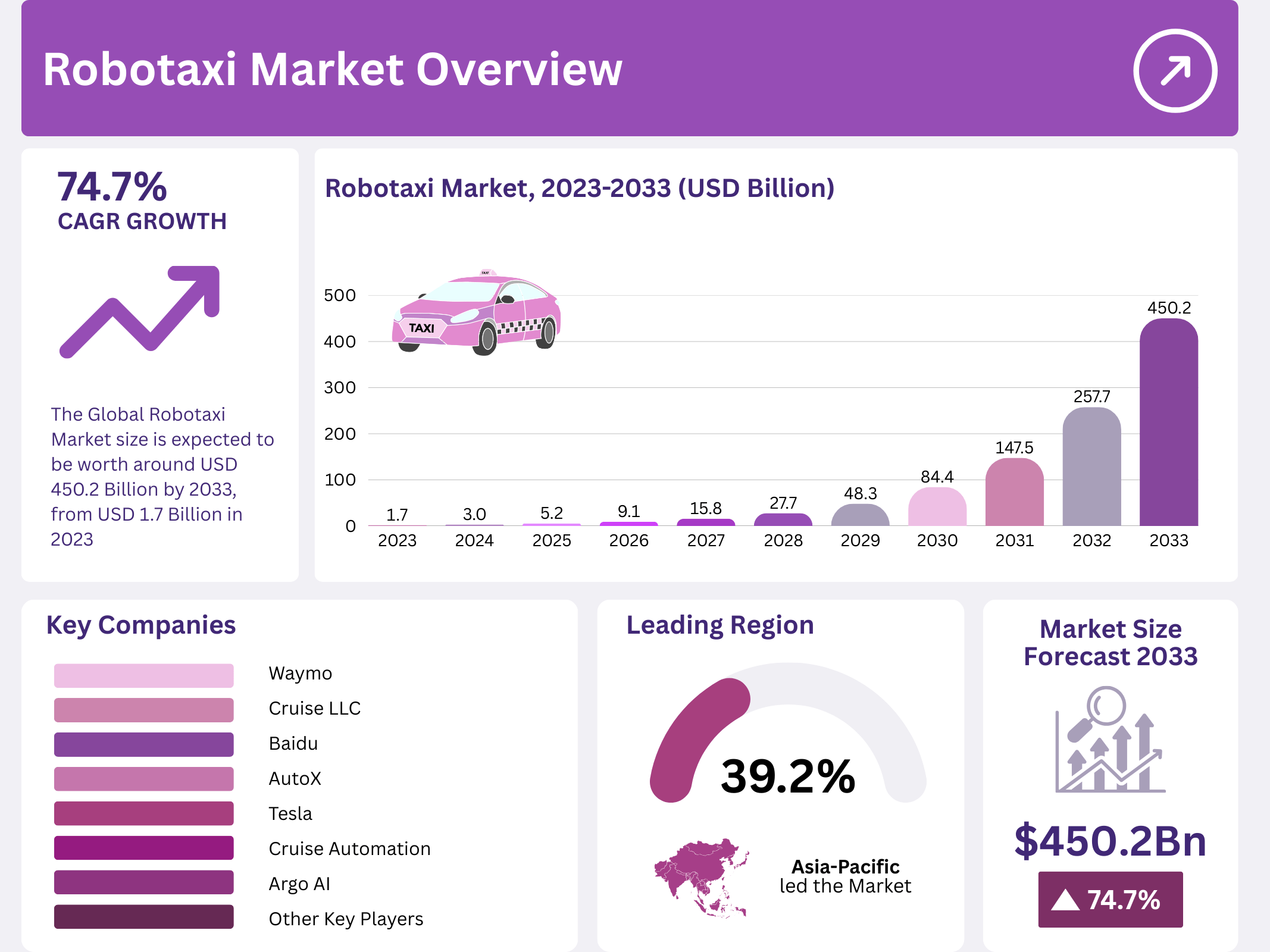 - The Robotaxi Market was valued at USD 1.7 billion in 2023 and is anticipated to reach USD 450.2 billion by 2033, exhibiting a CAGR of 74.7%.