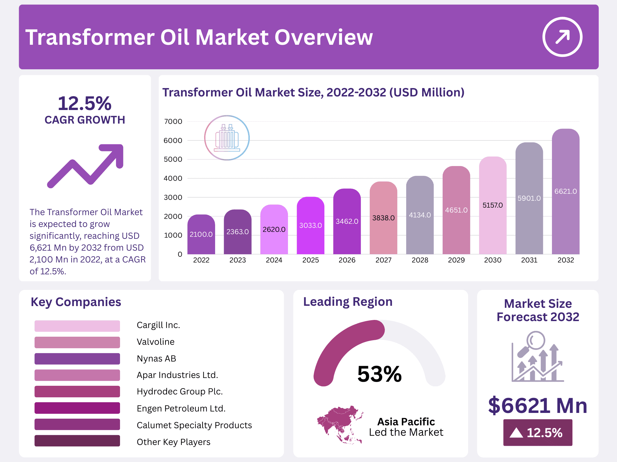 - The Global Transformer Oil Market is expected to grow significantly, reaching USD 6,621 million by 2032 from USD 2,100 million in 2022, at a strong CAGR of 12.5%.