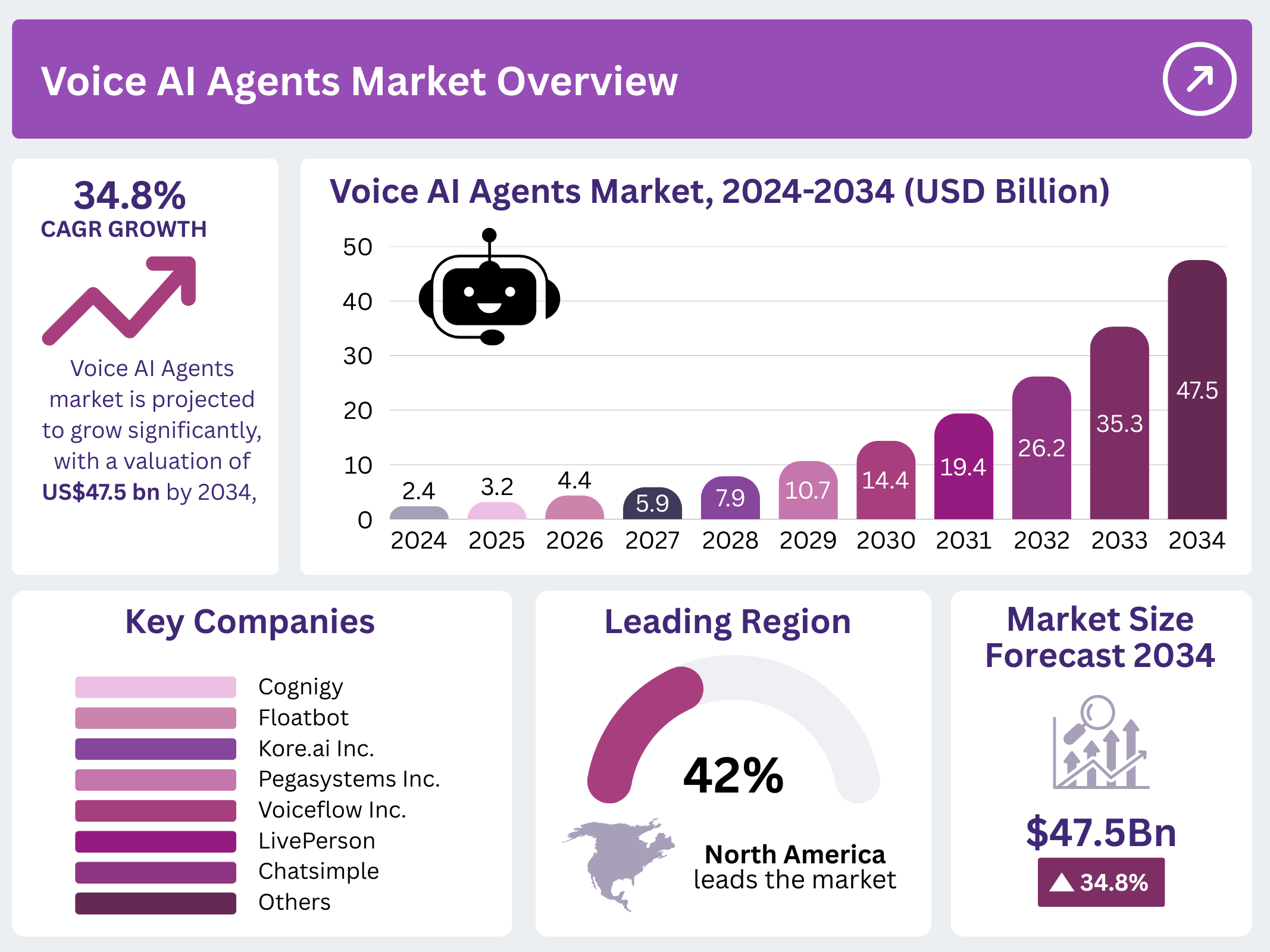 - The global Voice AI Agents market is projected to reach US$47.5 billion by 2034, rising from US$2.4 billion in 2024, at a 34.8% CAGR.