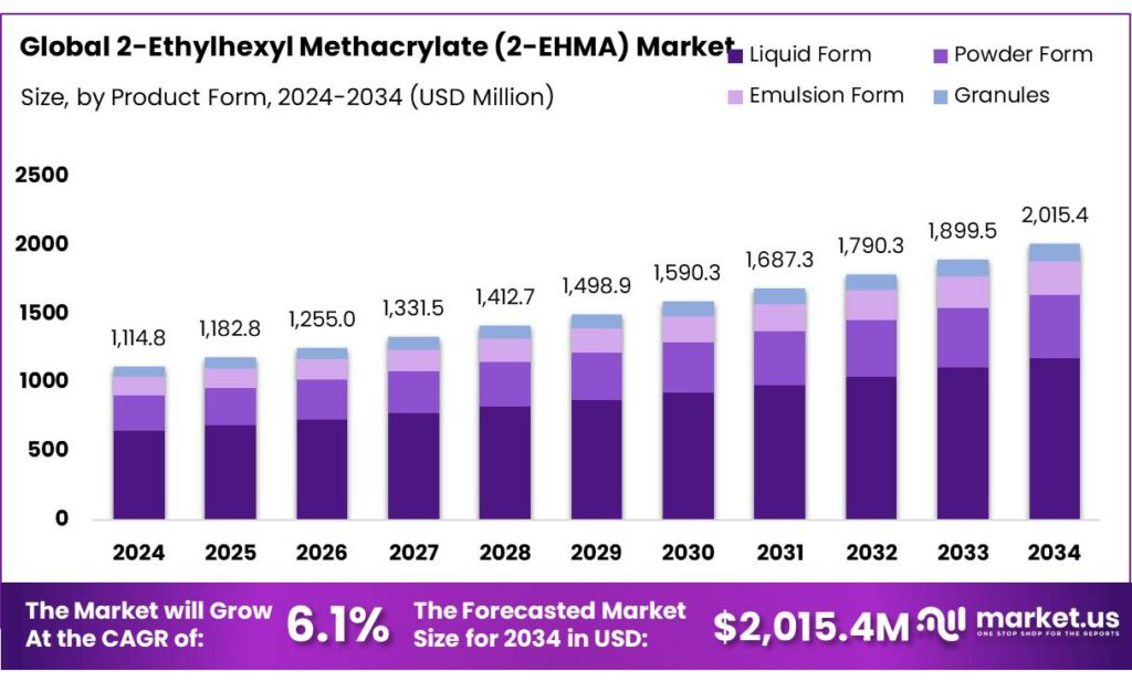 - 2-Ethylhexyl Methacrylate (2-EHMA) Market size is expected to be worth around USD 2015.4 Million by 2034, from USD 1114.8 Million in 2024, growing at a CAGR of 6.1%.