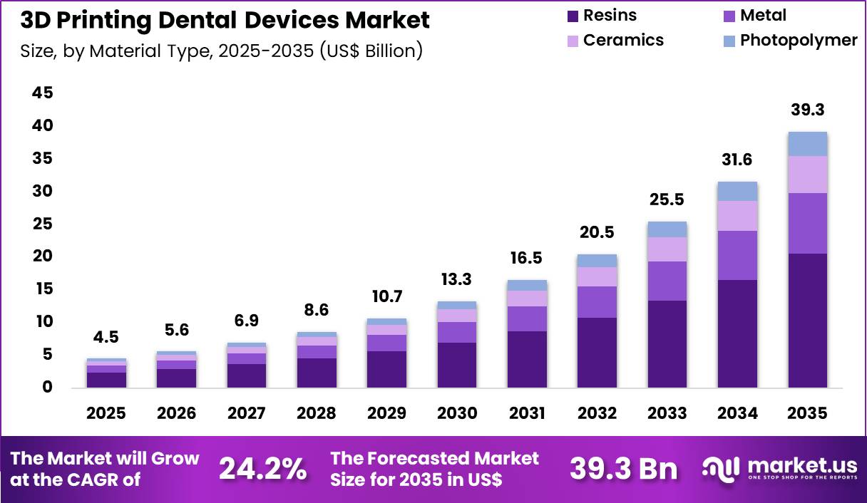 Dental laboratories accounted for 56.7% of growth within end users and dominate the 3D printing dental devices market due to their central role in manufacturing customized dental restorations and orthodontic components. Laboratories possess specialized equipment and technical expertise required for digital dental manufacturing workflows.