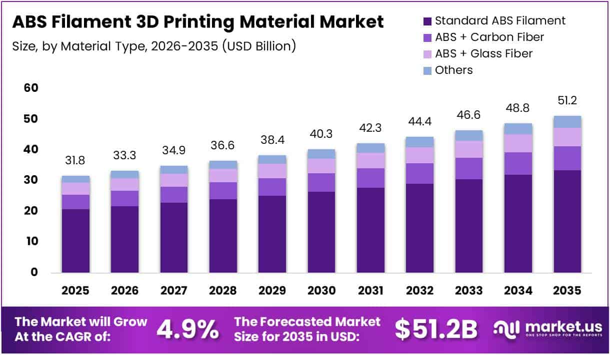 - Global ABS Filament 3D Printing Material Market projected to reach USD 51.2 Billion by 2035 from USD 31.75 Billion in 2025 at 4.9% CAGR