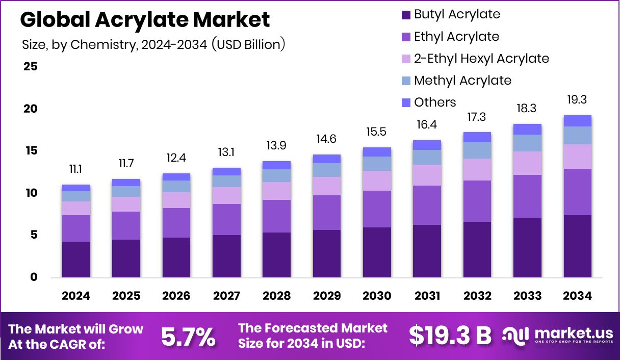 - Global Acrylate Market is expected to be worth around USD 19.3 billion by 2034, up from USD 11.1 billion in 2024, and grow at a CAGR of 5.7% from 2025 to 2034.
