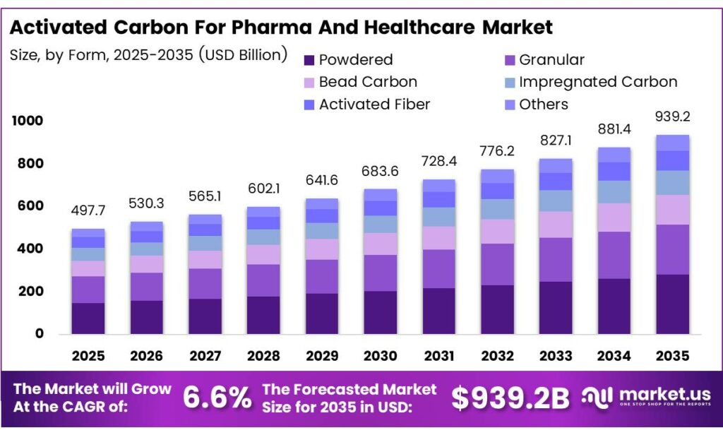 - The Global Activated Carbon For Pharma And Healthcare Market, valued at USD 497.7 billion in 2025, is expected to reach USD 939.2 billion by 2035, at a CAGR of 6.6%.