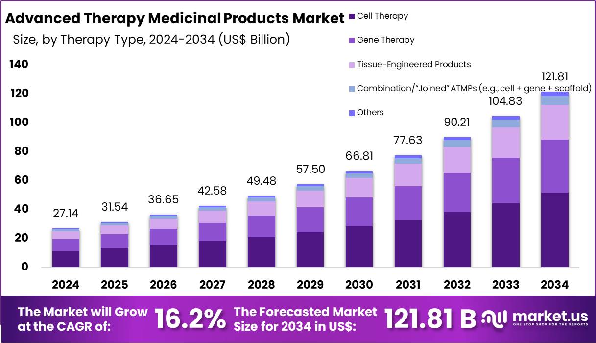 - The global ATMPs market was described as advancing toward US$121.81 billion by 2034, rising from US$ 27.14 billion in 2024 with a 16.2% CAGR.