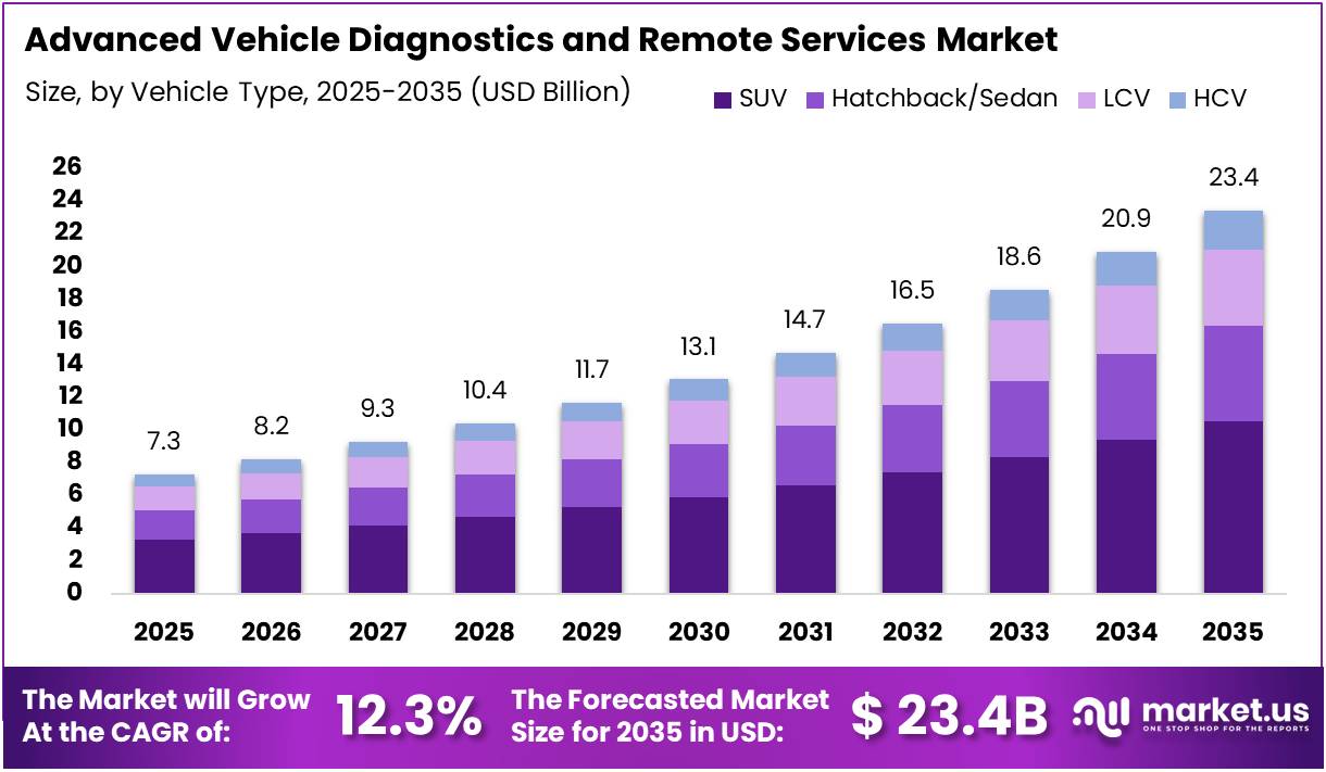 The Global Advanced Vehicle Diagnostics and Remote Services Market size is expected to be worth around USD 23.4 Billion by 2035 from USD 7.3 Billion in 2025, growing at a CAGR of 12.3% during the forecast period 2026 to 2035.