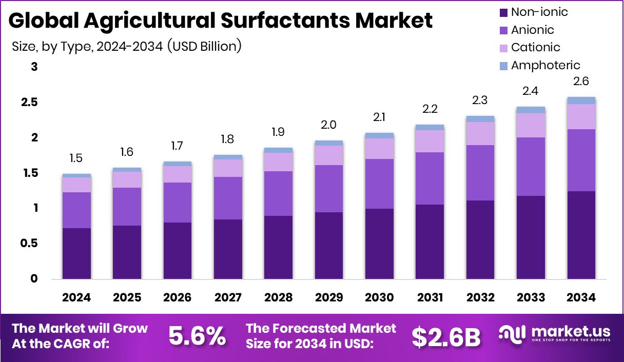 - The Global Agricultural Surfactants Market is expected to be worth around USD 2.6 billion by 2034, up from USD 1.5 billion in 2024, and is projected to grow at a CAGR of 5.6% from 2025 to 2034.