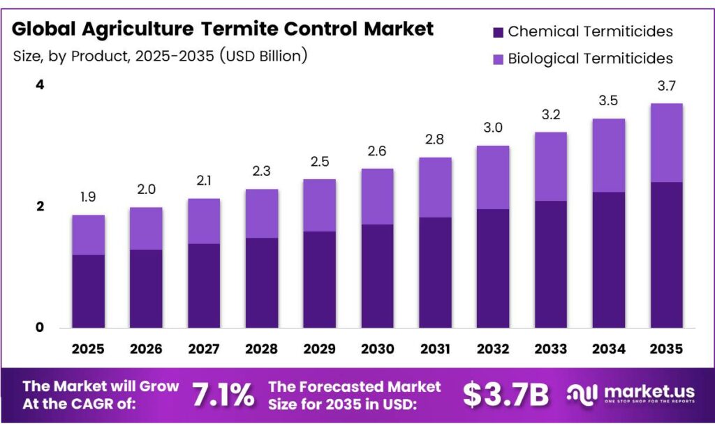 The Global Agriculture Termite Control Market size is expected to be worth around USD 3.7 billion by 2035 from USD 1.9 billion in 2025, growing at a CAGR of 7.1% during the forecast period 2026 to 2035.