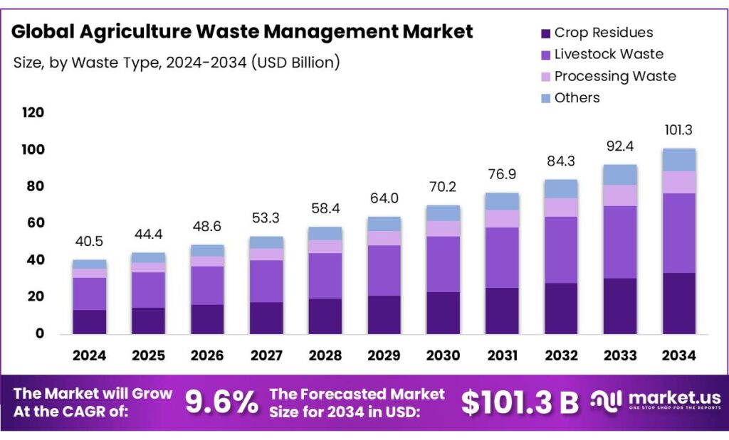 - The global agriculture waste management market is projected to grow at a CAGR of 9.6% and is estimated to reach USD 101.3 billion by 2034.