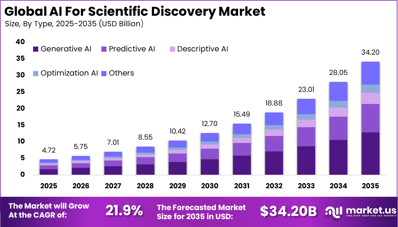 - The U.S. AI for Scientific Discovery market was valued at USD 1.68 billion in 2025 and is projected to expand at a 18.32% CAGR, supported by strong investment in biomedical and computational research.