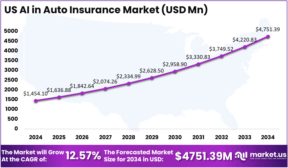 Market Growth: The global AI in Auto Insurance Market was valued at USD b million in 2024 and is projected to reach USD 5,934.0 million by 2034, growing at a CAGR of 15.10% during the forecast period.