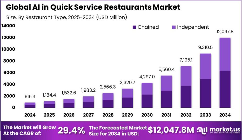- The Global AI in Quick Service Restaurants (QSR) Market size is projected to reach USD 12,047.8 Million by 2034, up from USD 915.3 Million in 2024, growing at a CAGR of 29.40% during the forecast period from 2025 to 2034.