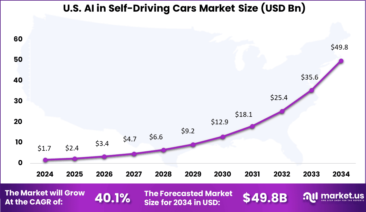 Focusing on the U.S., the AI in self-driving cars market was valued at around USD 1.71 billion in 2024 and is projected to grow rapidly with a staggering CAGR of 40.1%. This explosive growth is fueled by a favorable regulatory environment, substantial government and private sector investments, and consumer demand for enhanced safety and convenience.