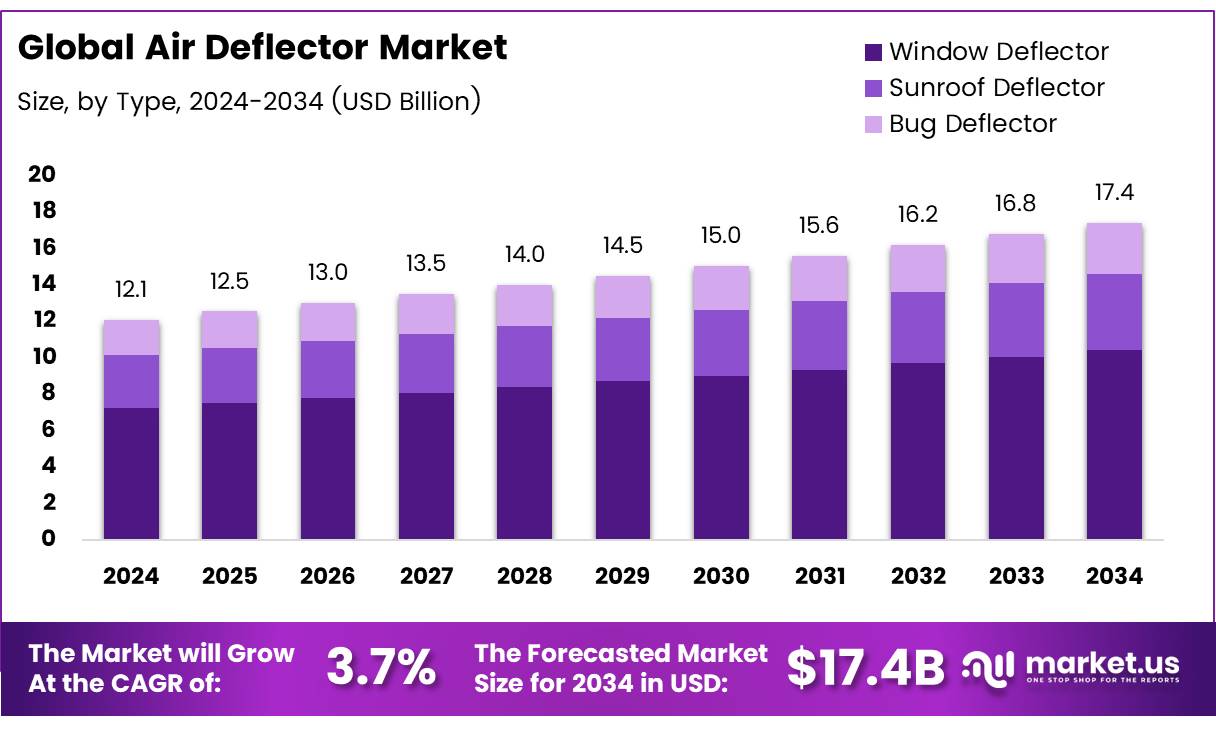 The Global Air Deflector Market size is expected to be worth around USD 17.4 Billion by 2034, from USD 12.1 Billion in 2024, growing at a CAGR of 3.7% during the forecast period from 2025 to 2034.