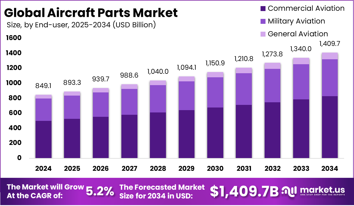 The Global Aircraft Parts Market size is expected to be worth around USD 1409.7 billion by 2034, from USD 849.1 billion in 2024, growing at a CAGR of 5.2% during the forecast period from 2024 to 2033.