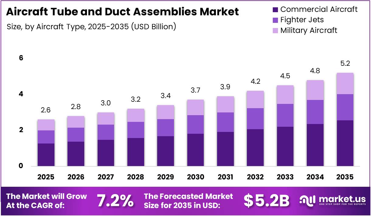 The Global Aircraft Tube and Duct Assemblies Market size is expected to be worth around USD 5.2 Billion by 2035 from USD 2.6 Billion in 2025, growing at a CAGR of 7.2% during the forecast period 2026 to 2035.