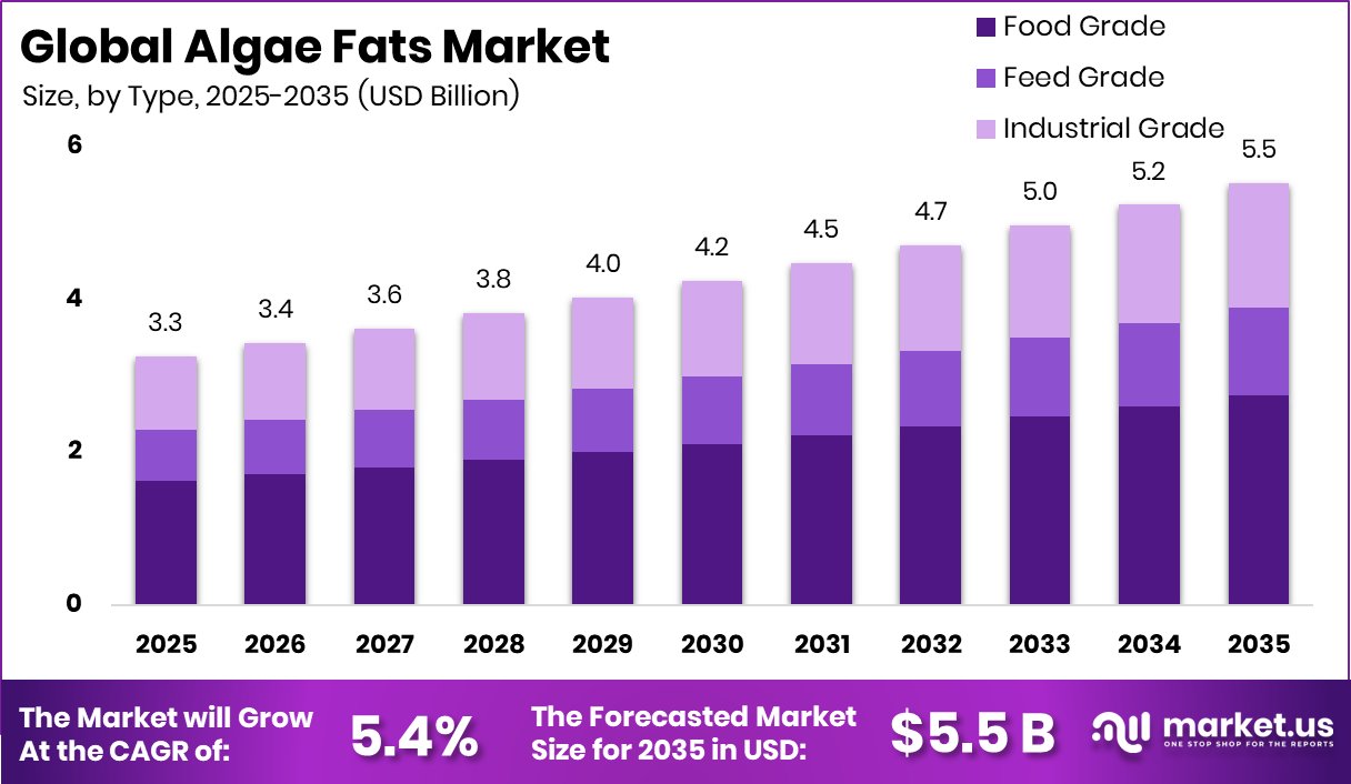 - The Global Algae Fats Market is expected to be worth around USD 5.5 billion by 2034, up from USD 3.3 billion in 2024, and is projected to grow at a CAGR of 5.4% from 2025 to 2034.