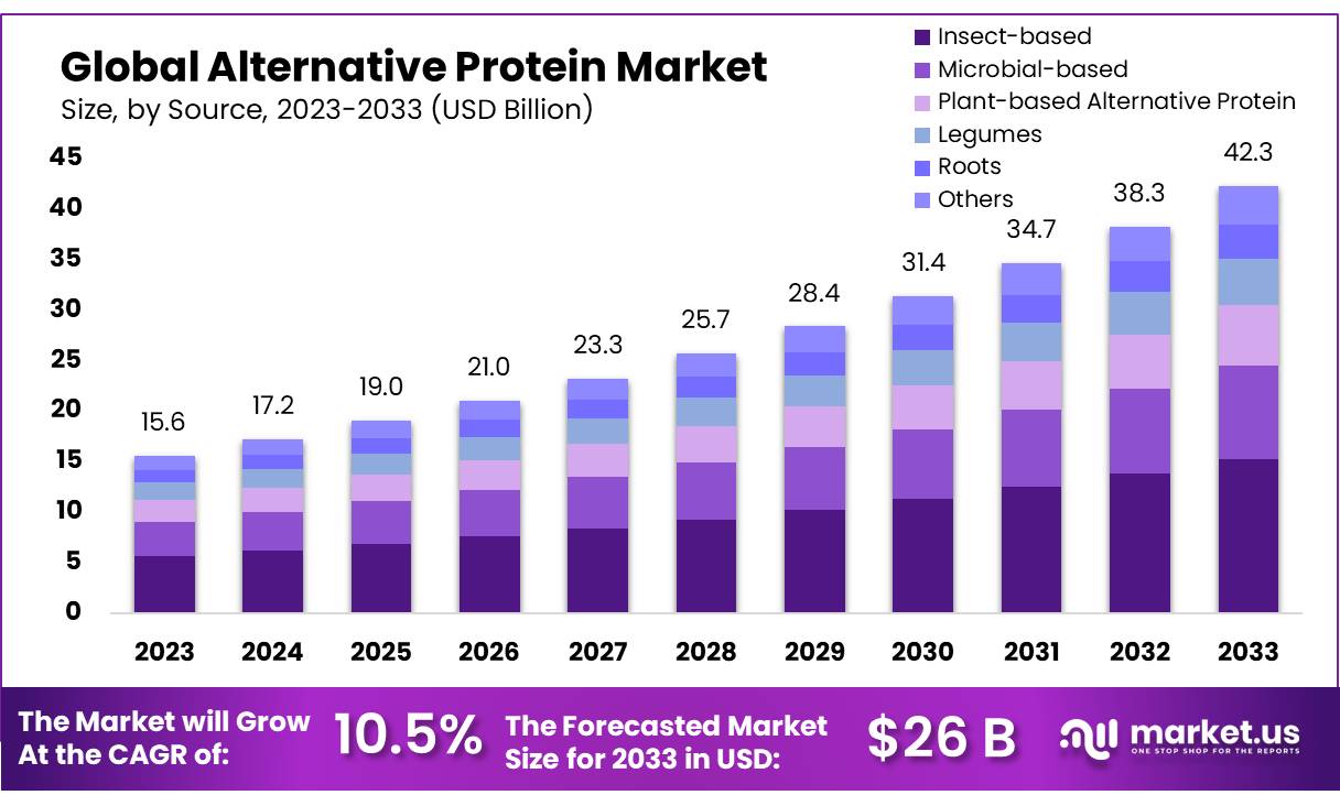 - Alternative Protein Market size is expected to be worth around USD 42.3 Bn by 2033, from USD 15.6 Bn in 2023, growing at a CAGR of 10.5%.