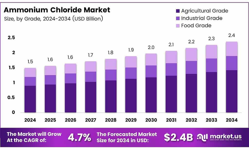 - The Global Ammonium Chloride Market is projected to grow from USD 1.5 billion in 2024 to USD 2.4 billion by 2034, registering a 4.7% CAGR during 2025–2034.
