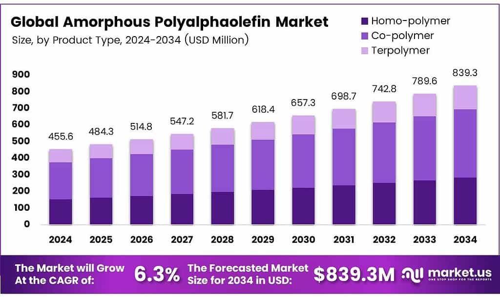 The Global Amorphous Polyalphaolefin Market size is expected to be worth around USD 839.3 Million by 2034, from USD 455.6 Million in 2024, growing at a CAGR of 6.3% during the forecast period from 2025 to 2034.
