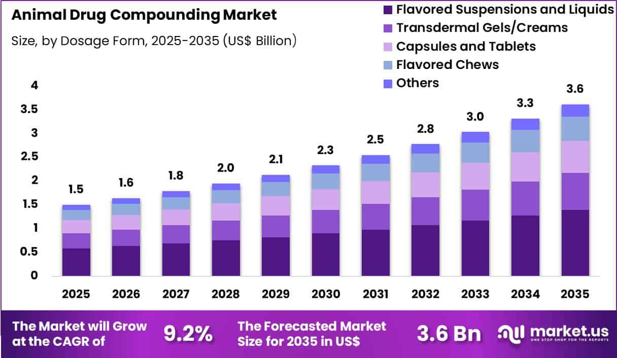 Report Features Description Market Value (2025) US$ 1.5 Billion Forecast Revenue (2035) US$ 3.6 Billion CAGR (2026-2035) 9.2% Base Year for Estimation 2025 Historic Period 2020-2024 Forecast Period 2026-2035 Report Coverage Revenue Forecast, Market Dynamics, COVID-19 Impact, Competitive Landscape, Recent Developments Segments Covered By Dosage Form (Flavored Suspensions and Liquids, Transdermal Gels/Creams, Capsules and Tablets, Flavored Chews and Others), By Product (CNS Agents, Anti-infective Agents, Anti-inflammatory Agents, Hormones & Substitutes and Others), By Route of Administration (Oral, Injectable, Topical and Other Routes), By Animal (Companion Animals and Livestock Animals) Regional Analysis North America – The US, Canada; Europe – Germany, France, U.K., Italy, Spain, Russia & CIS, Rest of Europe; Asia Pacific – China, India, Japan, South Korea, ASEAN, Australia & New Zealand, Rest of Asia Pacific; Middle East & Africa – GCC, South Africa, Rest of Middle East & Africa; Latin America – Brazil, Mexico, Rest of Latin America Competitive Landscape Wedgewood Pharmacy, Akina Animal Health, Central Compounding Center South, AVRIO Pharmacy, NexGen Pharmaceuticals, Pace Pharmacy, SaveWay, ScriptWorks, Summit Veterinary Pharmacy, Apothecary & Co., Veterinary Pharmaceutical Solutions. Customization Scope Customization for segments, region/country-level will be provided. Moreover, additional customization can be done based on the requirements. Purchase Options We have three licenses to opt for: Single User License, Multi-User License (Up to 5 Users), Corporate Use License (Unlimited User and Printable PDF)
