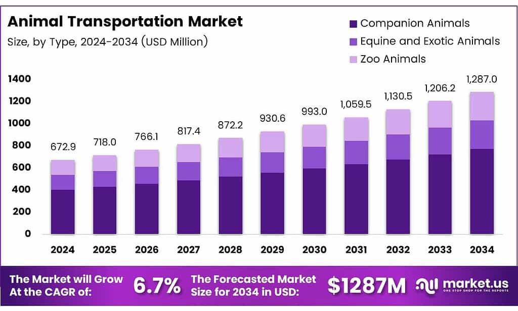 - The Global Animal Transportation Market was valued at USD 672.9 million in 2024 and is projected to reach USD 1,287.0 million by 2034, at a CAGR of 6.7% during the forecast period 2025 to 2034.
