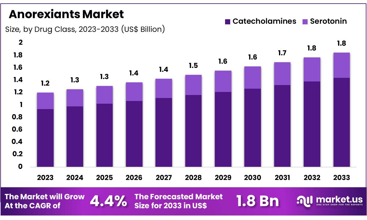 - Market Size: Anorexiants Market size is expected to be worth around US$ 1.8 Billion by 2033 from US$ 1.2 Billion in 2023.