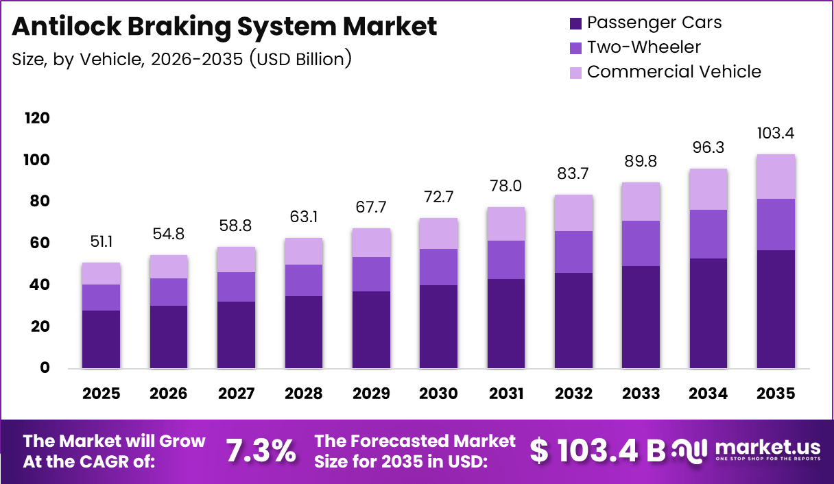 The Global Antilock Braking System Market size is expected to be worth around USD 103.4 Billion by 2035, from USD 51.1 billion in 2025, growing at a CAGR of 7.3% during the forecast period from 2026 to 2035.
