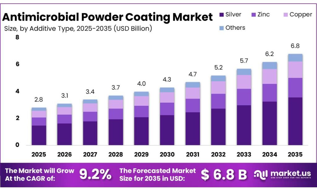 - Antimicrobial Powder Coating Market size is expected to be worth around USD 6.8 Billion by 2035, from USD 2.8 Billion in 2025, growing at a CAGR of 9.2%.
