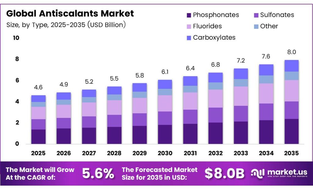 The Global Antiscalants Market size is expected to be worth around USD 8.0 billion by 2035 from USD 4.6 billion in 2025, growing at a CAGR of 5.6% during the forecast period 2026 to 2035.
