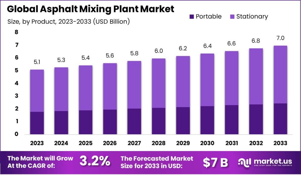The Global Asphalt Mixing Plant Market size is expected to be worth around USD 7.0 Billion by 2033, from USD 5.1 Billion in 2023, growing at a CAGR of 3.2% during the forecast period from 2024 to 2033.