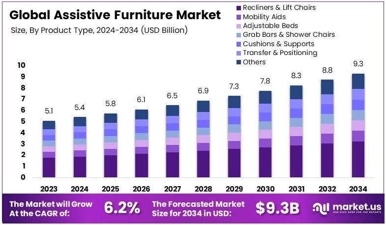 - The Assistive Furniture Market was valued at USD 5.1 Billion in 2024, and is expected to reach USD 9.3 Billion by 2034, with a CAGR of 6.2%.