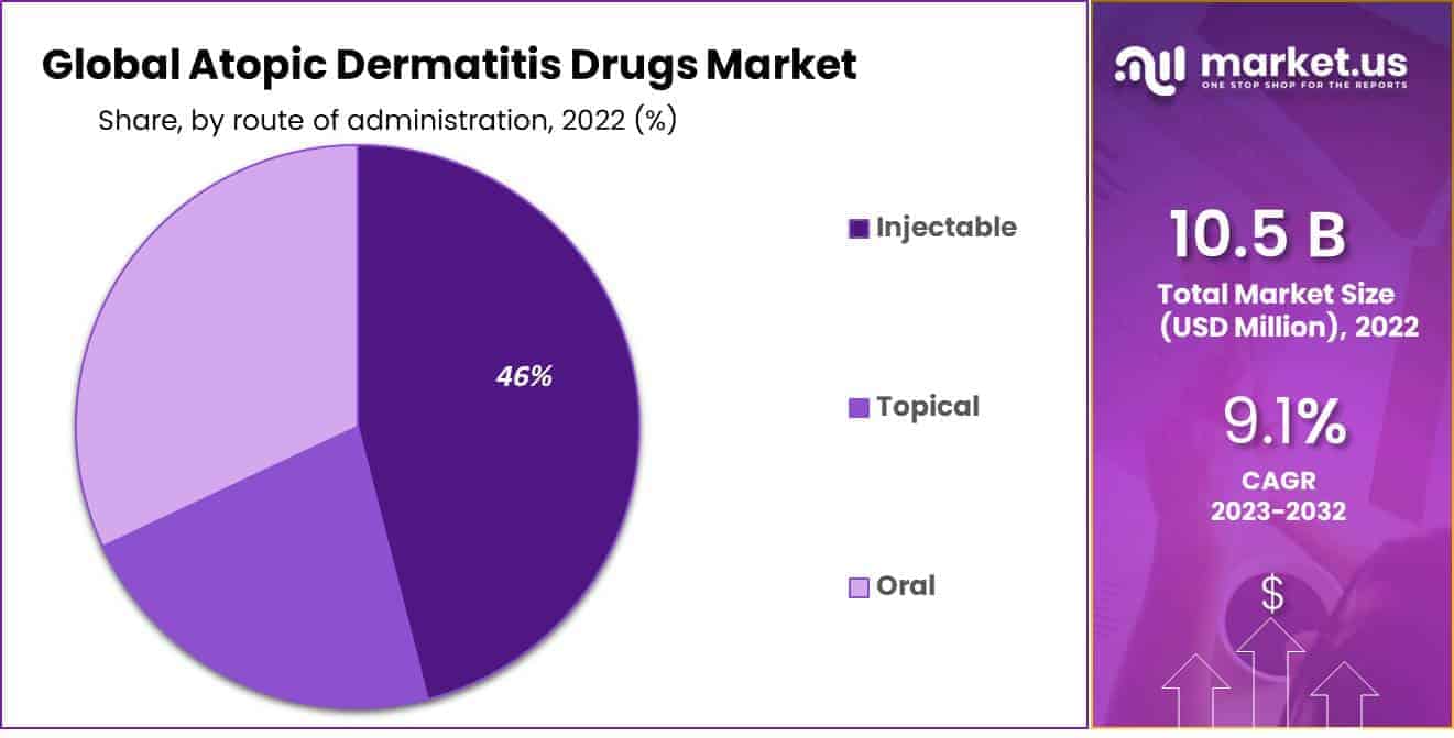 The injectable segment dominates the market with the highest revenue share of 46% and will likely maintain its dominance over the forecast period. This is because of the increased use of injectable products like Dupilumab.