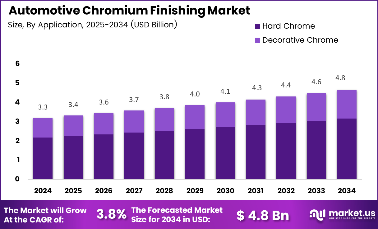 - The global Automotive Chromium Finishing Market is projected to reach USD 4.8 billion by 2034, growing from USD 3.3 billion in 2024 at a CAGR of 3.8%.