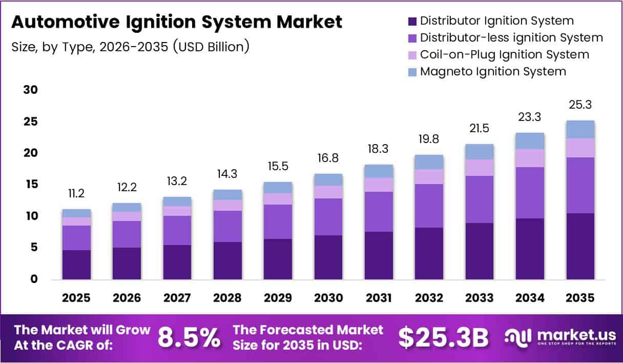 Global Automotive Ignition System Market size is expected to be worth around USD 25.3 Billion by 2035 from USD 11.2 Billion in 2025, growing at a CAGR of 8.5% during the forecast period 2026 to 2035.