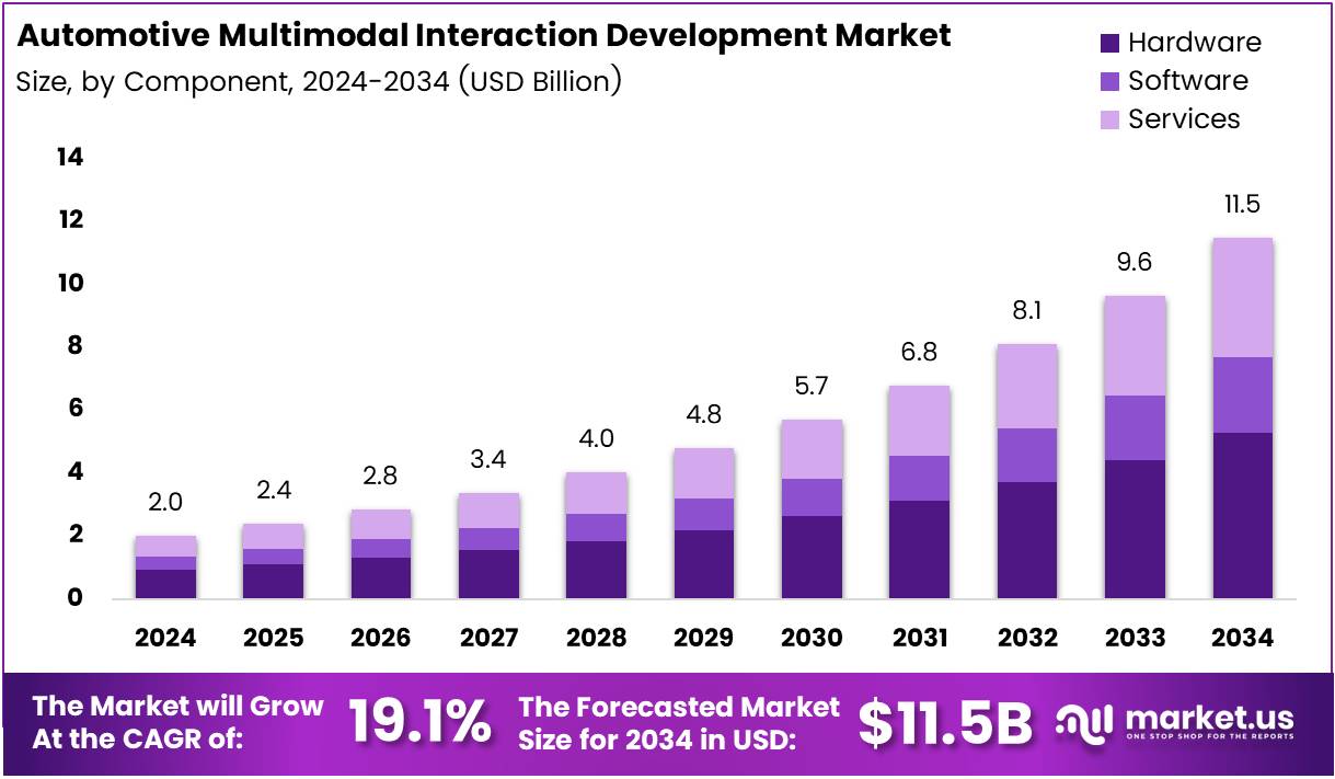 The Global Automotive Multimodal Interaction Development Market size is expected to be worth around USD 11.5 Billion by 2034, from USD 2.0 Billion in 2024, growing at a CAGR of 19.1% during the forecast period from 2025 to 2034.